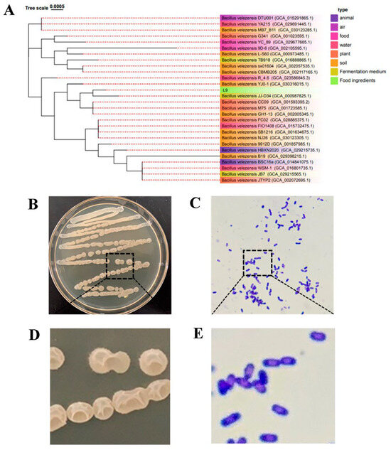 The phylogenetic tree and morphological characteristics of L9 strain. (A) Phylogenetic tree of the based on 16S rRNA gene sequences. (B,D) Cultures of L9 strain grown on LB agar medium for 24 h at 37 °C. (C,E) Gram staining results of L9 strain under a light microscope (100×, 1000×).