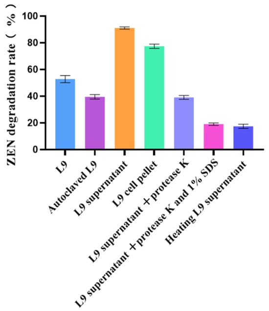 As can be observed from Figure 3, living cell bacteria exhibit a greater adsorption capacity than autoclaved bacteria. The degradation rate of the L9 supernatant was significantly higher than that of the L9 cell pellet, suggesting that the ability of the strain to degrade ZEN occurred mainly in the cell pellet. Additionally, the active substance of the strain to degrade ZEN occurred mainly outside the cell. The efficiency of the L9 supernatant degradation of ZEN was reduced to 47.61% after treatment with protease K. After co-treatment with protease K and 1% SDS, the degradation efficiency of ZEN decreased to 20.16%. The degradation efficiency of the strain decreased to 14.83% after a 100 °C bath for 2 h. The results showed that both Bacillus velezensis L9 and its supernatant showed detoxification of ZEN, suggesting that Bacillus velezensis L9 detoxification of ZEN includes both adsorption and degradation functions.