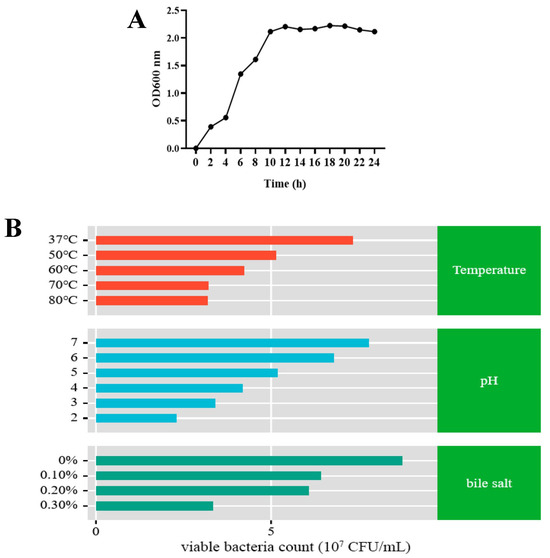 Biological characteristics of L9 strain. (A) Growth curve of L9 strain. (B) Tolerance assay of L9 strain. Tests for resistance to temperature, acid, and bile salts were conducted by assessing the OD600 value using a spectrophotometer and incorporating it into the regression formula to determine the count of living bacteria.