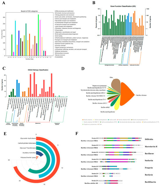 Genome annotation of L9 strain. (A) COG function classification of protein-coding genes. (B) GO function classification of protein-coding genes. (C) KEGG pathway classification of protein-coding genes. (D) Pie chart of the homology distribution. (E) CAZy classification result. (F) Predictive analysis of secondary metabolite gene clusters.