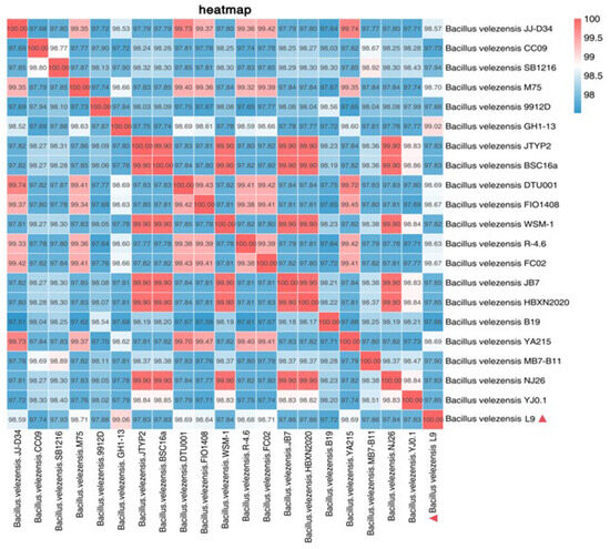 Based on the results of the whole-genome sequence comparison, 20 strains with the highest similarity to strain L9 were selected, and the genome sequences of these 20 strains were downloaded from the Assembly database of NCBI, and then the ANI values between strain L9 and the selected 20 strains were calculated using the JSpeciesWS. The results showed that the ANI values of strain L9 and Bacillus velezensis GH1-13 were higher than 99% (99.02%), followed by Bacillus velezensis M75, which was 98.70%. This indicates that strain L9 may belong to the same species as Bacillus velezensis GH1-13 (Figure 7). According to the ANI analysis, the L9 strain was identified as Bacillus velezensis in terms of the similarity of the genomes calculated at the genome level.