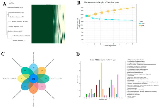The pan-genomes of eight Bacillus velezensis were determined using the Roary matrix. (A) A heatmap showing the gene presence (green) in each of the 8 strains. A phylogeny built based on the core genes is shown on the left. (B) Core-pan gene dilution box chart. (C) Number of ortholog clusters common and specific to each of the 8 strains. Flower centers indicate ortholog clusters that are common to all strains, and petals indicate those that are unique to each strain. (D) COG annotation of genes specific to the L9 strain.