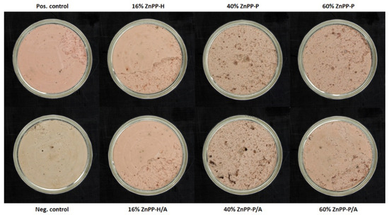 31]. The higher the concentration of ZnPP-rich ingredients, the higher the final pH. This finding can be attributed to the addition of TSPP to attain a pH of 7.5 in the ZnPP-rich ingredients. The higher ash contents of the 16% ZnPP-H and 16% ZnPP-H/A formulations compared with those of the ZnPP-P formulations could be due to the replacement of water with ZnPP-H containing dissolved salts. However, the pH range (from 6.63 to 6.87) was relatively narrow and similar to that reported in other studies [