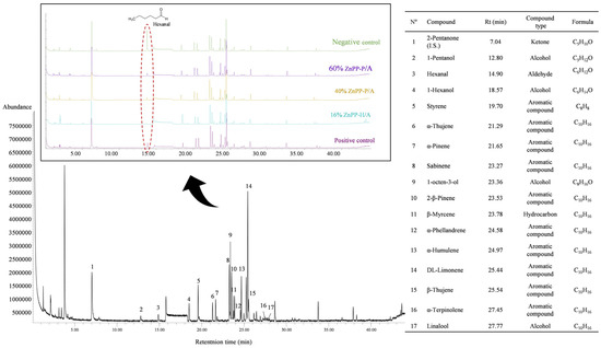 47]. Volatile terpenes are relatively abundant and relevant because of their low threshold values that determine the aromatic characteristics of the final product. These compounds originate from spice and herb addition, which explains the absence of major differences between the different pâté formulations. Therefore, the addition of ZnPP-rich ingredients did not substantially change the pâté volatile profile when compared with that of the positive control with nitrite.