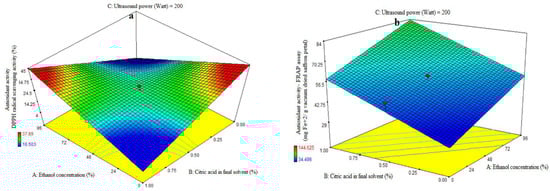 ANOVA was used to evaluate the first order polynomial models’ significance (Table 2). For every term in the models, a high F-value and a low p-value would suggest a more significant impact on the response variable. The antioxidant activity coefficients and matching p values are listed in Table 2. The values of antioxidant activity R2, R2-adj, adeq accuracy, and coefficients of variation (CV) were, in that order, 0.85, 0.77, 8.53, and 7.76%. The first polynomial model was therefore demonstrated to be more fitting for the antioxidant activity assay than the other models. The ethanol concentration (A), citric acid concentration in the final solvent (B), and ultrasonic power (C) variables did not show significant linear coefficients (p > 0.01). The quadratic and cubic coefficients were not significant (p > 0.05), while the AB-interactive coefficients were significant (p < 0.05). The fit of the model was evaluated using a lack-of-fit test (p > 0.05), which shows how well the model can predict variation. The resulting extract exhibits diminishing and rising trends in antioxidant activity at low and high doses of citric acid, respectively, as the purity of ethanol in the final solvent increases. Moreover, increasing the proportion of citric acid in the final solvent demonstrated a reduction in the antioxidant activity of the extract at low and high levels of ethanol concentration, respectively (Figure 1a). The extraction of organic compounds from plant material is closely correlated with the compatibility of solvent ingredients. If the extracted components are well-polarized at the same polarity as the solvent, extraction will be easy; if not, extraction will be challenging. The low water-soluble phenolic content in saffron petals may explain the results, as only models with lower reliability were obtained, and mathematical models of low reliability should not be included. The rate of DPPH free radical scavenging was decreased when saffron petal extraction was performed with more water. This might be explained by the high impurity content of water extraction, which raises the amount of non-phenolic compounds and reduces the antioxidant property [24]. The antioxidant activity of an extract is strongly correlated with the solvent used, due to the individual components’ varying polarity and potential for antioxidant activity. Antioxidant extraction depends critically on the plant materials’ antioxidant compounds’ solubility in the extraction solvent. Plant substances exhibit a correlation between their antioxidant activity and the amount of phenolic chemicals present. Based on the molecular structure of benzoic and cinnamic acids, phenolic acids are free radical receptors. The presence of side chains and phenolic rings in the molecular structure increases the ability to withstand free radical degradation [25]. When compared to phenolic extracts, anthocyanin extracts had the highest antiradical activity across all solvents examined [26]. This suggests that increasing the water-to-alcohol ratio lowers the amount of anthocyanin extracted and, consequently, the antioxidant qualities of the extract. This is in line with the results of our investigation. When compared to non-polar solvents, extraction with highly polar ones produced a high extract yield but a low phenolic and flavonoid concentration. Strong antioxidant molecules are extracted from polar solvents, as indicated by the polarity-dependent increase in overall antioxidant activity [27,28]. Acidic extraction can facilitate the release of phytochemicals by breaking the plant’s cell walls. The performance of extraction depends on the solvent and its concentration. The saffron petal extract obtained from different solvents has different chemical compounds with varying antioxidant activity. Water extraction decreases antioxidant activity with higher citric acid concentration, while alcohol extraction with higher citric acid concentration provides higher activity levels (Figure 1a).