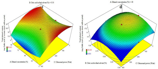 Impact of ethanol concentration (%), citric acid concentration in the final solvent (%), and ultrasound power (watt) on total anthocyanin content (mg Cyanidin-3-glucoside/g vacuum-dried saffron petal) (a) and total phenol content (mg Gallic acid/g vacuum-dried saffron petal) (b–d) in extracts obtained from the vacuum-dried saffron petals.