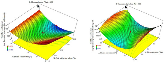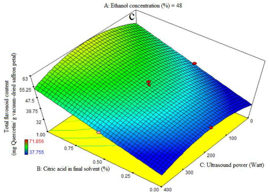 Impact of ethanol concentration (%), citric acid concentration in the final solvent (%), and ultrasound power (watt) on total flavonoid content (mg Quercetin/g vacuum-dried saffron petal). (a–c) in extracts obtained from the vacuum-dried saffron petals.