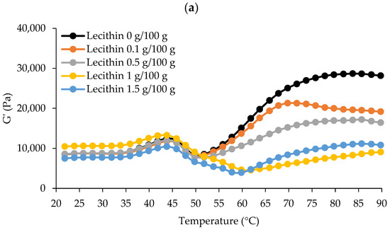 Tan δ for all samples was less than 1.0 because G′ values were greater than G″ values (Figure 1c). As a result, every sample displayed the properties of an elastic fluid with enhanced gelling ability [27]. Tan δ differed between two sets of lecithin levels that followed the pattern of G′ and G″, showing that all surimi had undergone varying degrees of sol–gel transition after heating. Consequently, due to the rheological behavior, two-step heating (40 °C/30 min and 90 °C/20 min) can be used for the production of gels where all samples can gel to varying degrees.