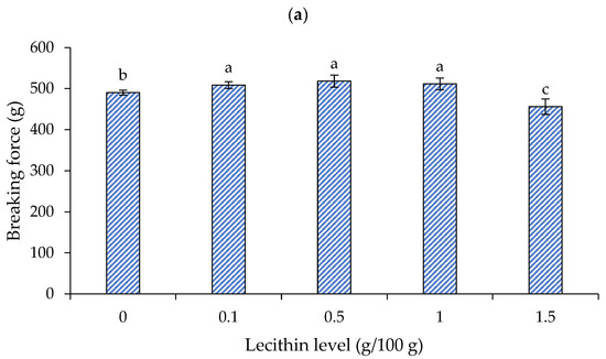 For the breaking force (Figure 2a), lecithin at 0.1, 0.5, and 1 g/100 g showed an improved breaking force, a rough increase of 4–6%, when compared to the control (without lecithin addition) (p < 0.05). When raising the lecithin level (up to 1.5 g/100 g), the breaking force of the gel dropped to about a 7% reduction (p < 0.05). The ideal level of lecithin to integrate into surimi has been reported to be species dependent. To produce surimi gel from Amur sturgeon (Acipenser schrenckii) surimi [20] and gurnard (Lepidotrigla microptera) surimi [12], respectively, lecithin at 0.1 g/100 g and 0.4–0.8 g/100 g was recommended. The optimal amount for lecithin was found at 1 g/100 g to produce bigeye snapper surimi gel [18]. The gel’s breaking force decreased as the lecithin level was raised above this concentration [12,18,20].