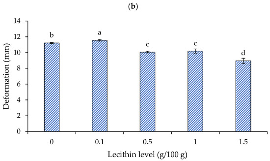 Deformation, however, responded to the lecithin in a different way than it did to the breaking force (Figure 2b). The surimi gel exhibited enhanced deformation (~3%) at a lecithin level of 0.1 g/100 g, the highest value (11.56 mm) (p < 0.05). Nonetheless, lecithin significantly decreased the surimi gel’s deformation at higher concentrations (0.5–1.5 g/100 g) (p < 0.05), and the gel containing lecithin at 1.5 g/100 g showed significantly decreased deformation (~20% decrease).