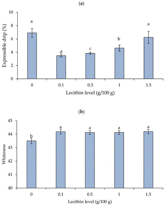 Expressible moisture (a) and whiteness (b) of gels from single-washed mackerel surimi added with varied lecithin concentrations. The standard deviations from triplicate determinations are represented by the bars. Significant differences (p < 0.05) are denoted by different letters.