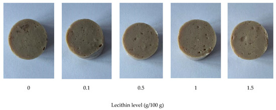 Figure 3b depicts the whiteness of gels made from single-washed mackerel surimi with varying lecithin concentrations. Whiteness is a key determinant of surimi gel quality [30]. Normally, the color of surimi gel was impacted by the particular type and level of food additives [28]. Vegetable oil, such as soybean oil, corn oil, and VCO, both in bulk and pre-emulsified forms (i.e., nanoemulsion), have been used to increase the surimi gel’s whiteness [29,31,32]. The reason for this is that the surimi gel’s increased light scattering makes it appear whiter [18,28]. In particular, the light scattering potential of the emulsion generated following chopping resulted in a lighter surimi gel when combined with oil [28]. According to Benjakul et al. [28], adding 1–5 g/100 g of soybean oil can enhance the whiteness of mixed surimi. In accordance with Pietrowski et al. [31], the corn oil-infused Alaska pollock surimi gel was likewise lighter than the control. The gel’s color became whiter than the control when surimi was mixed with VCO in the form of bulk oil and nanoemulsion [33]. Oil is mostly made up of triglycerides; however, it may have different gel strengthening and whitening properties from lecithin, a polar lipid [18]. It has been shown that lecithin enhanced the surimi gel’s whiteness by enhancing the way that light was reflected. Lecithin incorporation at 1–3 g/100 g previously increased the whiteness of threadfin bream surimi [18]. Adding lecithin to mackerel surimi increased its whiteness marginally in this study, regardless of concentration. This was because mackerel muscle had a darker color and was more difficult to whiten than fish with white flesh, such as threadfin bream. According to the proposed approach outlined by Panpipat et al. [18], lecithin may align at the interface to form an emulsion in the system, which can improve the whiteness of surimi gel. Therefore, because of the introduction of the emulsion, it might enhance the whiteness of surimi gel [33]. Lecithin and muscle proteins have an emulsifying action; therefore, an emulsion should occur to some extent during chopping in the presence of lecithin. This occurrence may have contributed to the whiteness of the resulting gel. Figure 4 depicts the appearance of surimi gel in this study.