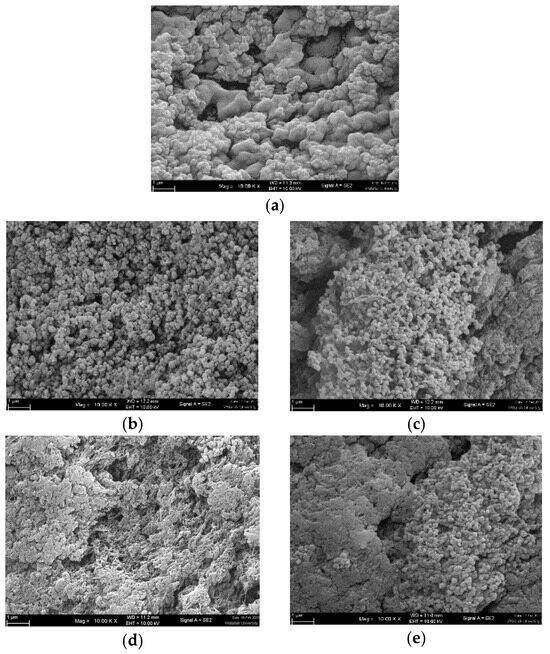 Electron microscopic images of gels from single-washed mackerel surimi added with varied lecithin concentrations. (a) = 0 g/100 g, (b) = 0.1 g/100 g, (c) = 0.5 g/100 g, (d) = 1 g/100 g, (e) = 1.5 g/100 g). Magnification: 10,000×, EHT: 5 kV.