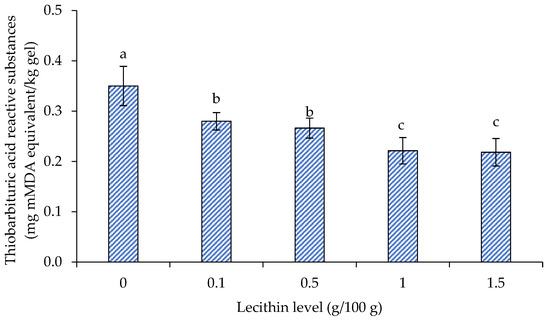 Thiobarbituric acid reactive substances (TBARS) of gels from single-washed mackerel surimi added with varied lecithin concentrations. The standard deviations from triplicate determinations are represented by the bars. Significant differences (p < 0.05) are denoted by different letters.