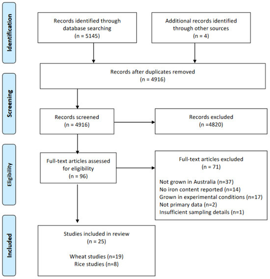 The search yielded a total of 5149 articles; 5145 were identified from literature databases and 4 were identified from gray literature searches (Figure 1). Following the removal of duplicates, 4916 articles were screened by title and abstract, which excluded 4820 articles. Full-text screening of 96 articles excluded a further 71 articles. Reasons for exclusion included samples grown outside Australia; not reporting numerical values of iron content; samples grown under experimental conditions; the source not reporting primary data; or the source having insufficient sampling details to determine the components of the grain analyzed. Of the 25 remaining articles, 19 analyzed wheat, 8 analyzed rice, and 2 analyzed both wheat and rice.