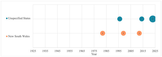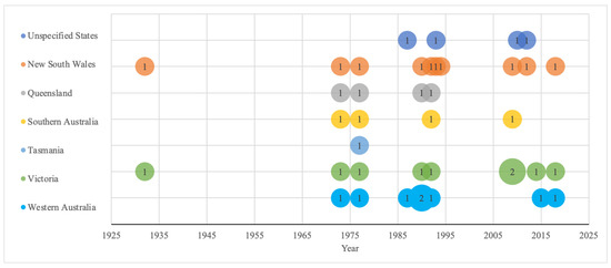 The articles sourced were published between 1930 and 2023, with most studies conducted between 1980 and 2020. Notably, no studies were published between 1932 and 1974. For wheat, most samples originated from New South Wales (NSW, n = 10), followed by Victoria (n = 9) and Western Australia (WA, n = 8), with the earliest samples analyzed in the 1930s (Figure 2). For rice, four studies examined samples from NSW, whilst the remaining studies did not specify the exact state (Figure 3). The earliest rice sample was analyzed in 1982.