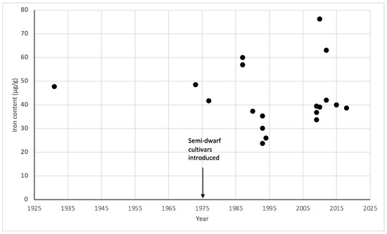 Findings from this review can be compared to overseas studies, including those conducted in Europe and the United States. One of the world’s longest-running field studies is the Broadbalk Continuous Wheat Experiment, commenced in Rothamsted, England, in 1843 [47]. Fan et al., analyzed archived samples from this experiment and found that mean concentrations were 23–27% lower between 1968 and 2005 compared to the previous period (between 1845 and 1967), coinciding with the introduction of higher-yielding cultivars in the 1960s [11]. In the United States, Garvin et al., (2006) examined 14 common wheat varieties (hard red winter wheat) representing the production eras between 1830 and the late 1990s. The study found a negative relationship between yield and iron concentration, and that newer, higher-yielding cultivars contained lower iron levels [48]. Similarly, Murphy et al., investigated 56 historical cultivars and 7 higher-yielding modern wheat cultivars in the US and reported that modern cultivars had significantly lower iron mineral concentrations compared with older cultivars (32.3 vs. 35.7 μg/g) [49]. However, the presence of several modern high-yielding cultivars with high micronutrient concentrations indicated that this is not always the case due to genetic variability. In Australia, modern semi-dwarf wheat varieties were introduced in the mid 1970s, and subsequent adaptations and improvements in cultivars and agricultural practices over the years have led to further yield gains (Brennan). The three studies that analyzed the iron content of wheat grown prior to 1980 in Australia [20,21,22] reported mean iron values between 42 and 49 μg/g, while the majority of values were between 25 and 45 μg/g after 1980.