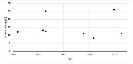 This review revealed a significant degree of heterogeneity in sampling methods across studies. The analytical method of measuring iron content has evolved over time. Early wet chemistry methods with low sensitivity, such as thiocyanate colorimetry, were replaced by chemical analytical instruments such as AAS in the 1970s [12]. This was followed by a transition to ICP methods, including ICP-AES, ICP-OES, and ICP-MS, after the 1990s, with improved detection limits and higher precision [63]. Changes in analytical methods have resulted in improved specificity and reductions in sample contamination stemming from equipment, reagents, and soil remnants [52,64]. This presents the potential of earlier studies yielding higher values and reflecting a modest level of analytical bias.