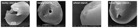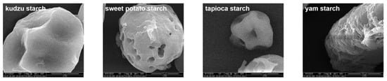 The preparation process is shown in Figure S1. Eleven common starches, including barley starch, broad bean starch, yam starch, potato starch, corn starch, acorn starch, sweet potato starch, wheat starch, batata starch, tapioca starch and kudzu starch, were selected, and 20 mL, 100 mM, pH 5.5 PBS buffer solution was added, respectively, and then put into a 50 °C water bath for a wet heat treatment for 20 min and then added with an equal volume of enzyme solution at 30 °C for a reaction of 48 h. Preliminary screening was carried out on different kinds of porous starch by the results of scanning electron microscopy and the water/oil adsorption rate of porous starch.