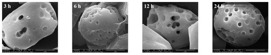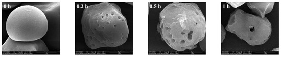 The effect of the enzyme on starch was more evident when the enzyme digestion time was prolonged (Figure 4). From the initial smooth surface of full starch granules, 10 min of enzymatic digestion alone produced fine pores. The pore size and pore capacity also increased significantly when the enzymatic digestion time was increased. This proves that the enzyme effectively acted on the starch’s internal structure and affected the morphology of its granules. The results were similar to those of Li Guo [13], who used glucoamylase, glycosylase, and α-amylase to obtain the synergistic effect of the three enzymes.