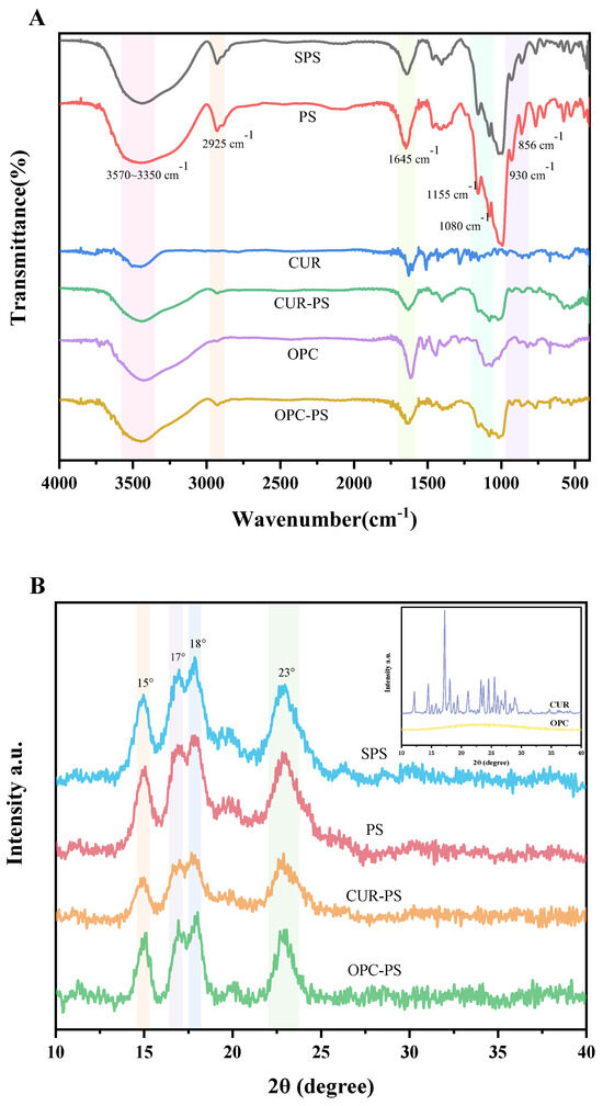 Characterization of sweet potato porous starch. (A) FT–IR spectra of SPS, PS, CUR, CUR–PS, OPCs, and OPC–PS, (B) X-ray diffractogram.