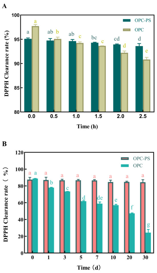 OPCs and OPC-PS were placed outdoors under natural light for 30 days. The DPPH radical scavenging rate was measured to compare changes in their antioxidant capacity over time.