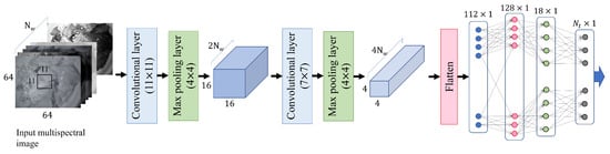 Automatic food classification can be formulated as a general pattern recognition problem based on images. In the multi-wavelength approach, instead of using just one of the RGB images, a combination of images acquired at each wavelength was used to classify the food items or to estimate the specific ingredients or calories in a particular food. Accordingly, two issues should be considered: the design of the pattern recognition methods particularly for food images and the optimal wavelength combinations in terms of food classification/analysis. In the present study, convolutional neural networks (CNNs) were employed to classify food images. A validation dataset was used to heuristically determine the architecture of the CNN (Figure 2). The ratio of the number of images in the validation and learning datasets was 1:10. Since pattern recognition was performed within a single category of food recognition, the resultant CNN had a relatively simple architecture compared with previously developed CNNs (e.g., VGG-16 [], ResNet152+ANN [], Inception-v3) that considered a variety of images and categories.