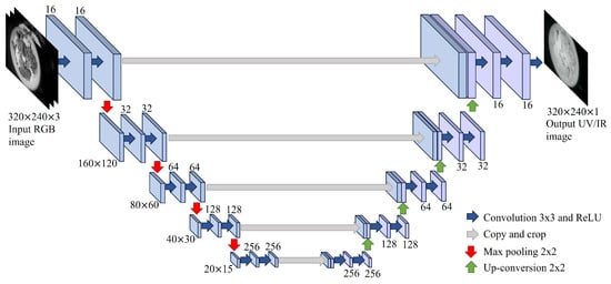 Using RGB images to estimate UV/NIR images could be basically be formulated as a problem of finding the pixel-by-pixel mapping rules between the two images. This is based on the assumption that a large amount of low-level information, such as the location of edges, is shared between the two images []. Despite the existence of shared information between the two images, each image has unique characteristics that cannot be explained by a simple dependency relationship. Therefore, it was reasonable that the correspondence between the two images was represented by non-linear mapping rules such as those of deep neural networks [,,,,,]. Similarly, a CNN was adopted to estimate UV/NIR images from RGB images in the present study. The CNN architecture used in this study is shown in Figure 3, which basically is similar to that of U-net []. In a previous study, a dual encoder-decoder based architecture with different depths [] and conditional generative adversarial networks [,] was employed to estimate NIR images from optical RGB images. These two architectures were tested in terms of food recognition and caloric estimation accuracy on the image dataset used in the present study. No clear performance advantage over the structure shown in Figure 3 was observed in our experiments. A small modification was made to the architecture of the original U-net to meet the objectives of the present study (food classification and caloric estimation). At each layer, the convolution kernel size (3 × 3), image depth (3-16-32-64-128-256-256-128-64-32-16-1) and pooling type (2 × 2 max pooling) was determined empirically using the validation dataset.