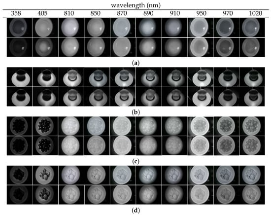 Examples of the original (top)/predicted (bottom) images at each wavelength for (a) corn soup, (b) coke, (c) tomato, and (d) pork.