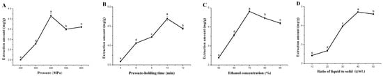 As the non-thermal technology, HHP can protect the sensitive molecules with mild temperatures and pressure holding time []. The contents of flavonoids in sea buckthorn could be affected by the HHP conditions, such as pressure, pressure-holding time, ethanol concentration liquid-to-solid ratio, pressure, and dwell time. First of all, the influence of each individual factor was explored through single-factor experiments and results of the ANOVA are shown in Figure 1. High pressures from 200 to 600 MPa were applied with pressure-holding time of 8 min, ethanol concentration of 70%, and a constant ratio of liquid-to-solid of 30 mL/g. As seen in Figure 1A, when the pressure increased from 200 MPa to 400 MPa, the initial value gradually increased, and the amount reached the highest value of 4.15 mg/g at 400 MPa. When the pressure was over 400 MPa, the SBF amount was decreased. Therefore, the pressure of 400 MPa was deemed to be the optimum extraction pressure standard. The effect of pressure-holding time on extraction amount of SBF is exhibited in Figure 1B. Firstly, it was set at 4, 6, 8, 10, and 12 min of pressure-holding time while other extraction parameters were given as follows: pressure at 400 MPa, ethanol concentration of 70%, and liquid-to-solid ratio 30 mL/g. During the extraction time from 4 to 10 min, the amounts were increasing; after that, it decreased 10 min later. It could be seen that the extraction process of active ingredients by high hydrostatic pressure method was fast, and the active ingredients could quickly diffuse into the solvent to achieve equilibrium. Therefore, the pressure-holding time of 10 min was selected for the further study.