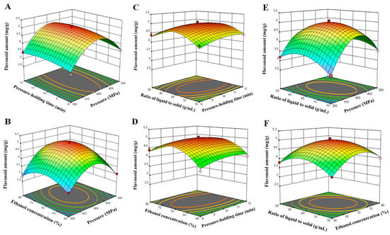 The plots for 3D response surface reveal the effect of (A) pressure and pressure-holding time; (B) pressure and ethanol concentration; (C) pressure-holding time and ratio of liquid-to-solid; (D) pressure-holding time and ethanol concentration; (E) pressure and ratio of liquid-to-solid; (F) ethanol concentration and ratio of liquid-to-solid on the extraction amount of flavonoid.