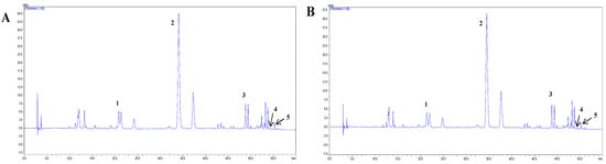 The chemical structures of flavonoids components and HPLC chromatogram of SBF (A) and PSBF (B) obtained by HHP under optimum conditions (415 MPa, ethanol concentration 72%, liquid-to-solid ratio 40 mL/g, time 10 min, and temperature 20 °C). Peaks 1, 2, 3, 4, and 5 represent rutin, quercitrin, quercetin, kaempferol, and isorhamnetin, respectively.