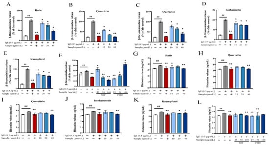 Flavonoids play an anti-allergic, anti-inflammatory, and anti-oxidant role by promoting wound healing and protecting the gut []. Firstly, the effects of SBF, PSBF, and five compounds on degranulation was assessed in RBL-2H3 cells sensitized by IgE. β-hexosaminidase and histamine, as main allergic mediators, were released by granulated mast cells stimulated with IgE []. Quercitrin at 40 μmol/L suppressed β-hexosaminidase release to a greater degree than quercetin, isorhamnetin, and kaempferol (Figure 4A–E). Antigen-stimulated RBL-2H3 cells treated with SBF significantly reduced β-hexosaminidase release and the inhibition ratio has a dose-dependent effect; in contrast, PSBF showed a converse trend (Figure 4F). The release of histamine was measured to further explore the inhibitory effects of SBF, PSBF, and five compounds on mast cell. SBF, PSBF, and five compounds turned out to markedly decrease histamine secretion in antigen-stimulated RBL-2H3 cells (Figure 4G–L), especially quercitrin, quercetin, and isorhamnetin at 40 μmol/L, SBF at 100 μg/mL, and PSBF at 25 μg/mL. Cruz et al. [] found that extract of Kalanchoe pinnata could relieve degranulation and histamine secretion by antigen-induced mast cells, which proves that quercitrin is a critical component of extracts against the allergic reaction.