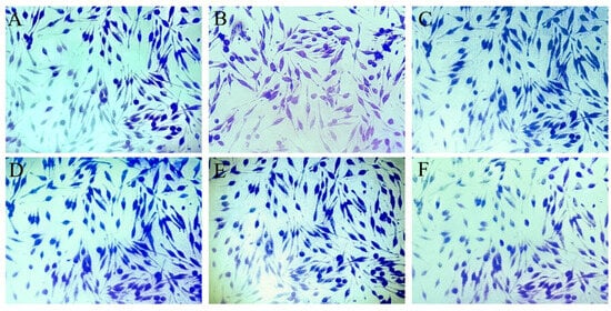 Following allergen stimulation and SBF, PSBF, and five compounds administration, the morphology of RBL-2H3 cells were changed after degranulation. As a synthetic basic dye, Toluidine blue can integrate with substances including acidic materials, histamine, and other heterochromous components secreted by mast cells, and then different colors can be observed []. After staining with toluidine blue dye in RBL-2H3 cells, the morphological changes were observed under an optical microscope. As shown in Figure 5A, the cells developed and refraction occurred normally in the control group, which manifested as long shuttle forms, and the numerous intracytoplasmic granule content was uniformly distributed in appearance. In contrast, there were typical degranulation morphology of the cells in allergy group, whose specific performance included irregular form, and remote and disorderly granule content within the cell cytoplasm (Figure 5B). All performance indicated that RBL-2H3 cells were undergoing the process of degranulation. RBL-2H3 cells treated with 40 μmol/L quercitrin, 100 μg/mL SBF, 25 μg/mL PSBF, and 100 μmol/L ketotifen fumarate were found to restore and elongate in shape, and increase the intracytoplasmic granule content (Figure 5C–F), which proved treatment inhibited degranulation in cells. In addition, treatments of quercitrin and SBF revealed a superior suppression on degranulation (Figure 5D,E).