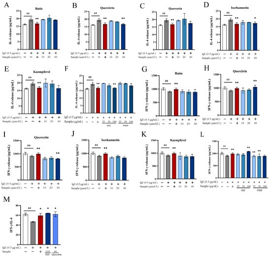IL-4 and IFN-γ are inflammatory cytokines and make a contribution in inflammatory and allergic disorders []. Thus, we investigated the effects of SBF, PSBF, and five compounds on IL-4 and IFN-γ release in RBL-2H3 cells sensitized by IgE. As observed in Figure 6, after being sensitized with DNP-specific IgE antibody and provoked by antigen DNP-BSA, RBL-2H3 cells secreted plenty of IL-4, which increased significantly (p < 0.01) while IFN-γ production reduced significantly (p < 0.05). Meanwhile, 40 μmol/L quercitrin, isorhamnetin, and 100 μg/mL SBF significantly reduced cellular IL-4 levels, while 40 μmol/L quercitrin and 100 μg/mL SBF were the only compounds that could observably (p < 0.01) increase the levels of IFN-γ (Figure 6). The proportion of IFN-γ to IL-4 levels secreted by cells was generally employed as the standard to determine the polarization status of Th1/Th2 cells. The results reveal that the ratio of IFN-γ/IL-4 of RBL-2H3 cells in the allergy model group was 46.70, while the ratio in the control group was 61.78 (Figure 6M). When the cells were treated with 40 μmol/L quercitrin and 100 μg/mL SBF, the ratio of IFN-γ/IL-4 was 62.25 and 64.31, respectively. However, there were no significant differences between that in the positive group and the control group (Figure 6M). It indicates that RBL-2H3 cells with sensitization and stimulation treated with 40 μmol/L quercitrin and 100 μg/mL SBF could recover the ratio of IFN-γ/IL-4, which resulted in the polarization of Th1/Th2 cells towards normality and the Th1/Th2 balance being regulated.