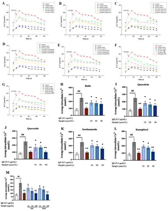 Effect of SBF, PSBF cellular Ca2+ in RBL-2H3 cell. (A) Rutin; (B) quercitrin; (C) quercetin; (D) isorhamnetin; (E) kaempferol; (F) SBF; (G) PSBF. Effect of five compounds (H–L) and SBF, PSBF (M) on average intracellular Ca2+ in RBL-2H3 cells. The positive control is ketotifen fumarate at 100 μmol/L. Results are expressed as the mean ± SD of three independent experiments. (## p < 0.01, * p < 0.05 and ** p < 0.01).