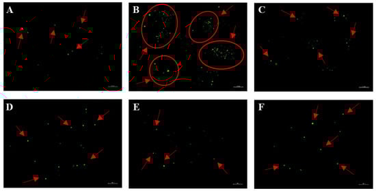 Effect of SBF, PSBF, and quercetin on intracellular Ca2+ in RBL-2H3 cells was observed on an inverted fluorescence microscope. The positive control is ketotifen fumarate at 100 μmol/L. (A) Control; (B) allergy model; (C) positive control; (D) 40 μmol/L of quercetin; (E) 100 μg/mL of SBF; (F) 100 μg/mL of PSBF.