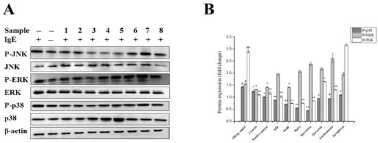 Up to 20% of the population suffer from allergic disease, and the prevalence of food allergies is on the rise globally []. When the interaction of allergen-specific IgE with its high-affinity IgE receptor (FcεRI) happens, establishing receptor cross-linking on sensitized mast cells or basophils and turn on to release pro-inflammatory mediators or cytokines, food allergic reactions occurs []. Upon allergen provocation, mast cells engender many kinds of inflammatory mediators, inducing immune responses to various external stimuli in the body []. Cytokines play essential roles in IgE immunoglobulin conversion on basophils, such as IL-4, which can lead to proliferation and differentiation in B cells []. There is a complicated battery of biochemical reactions in cross-linking of IgE molecules and their high affinity receptors, including calcium (Ca2+) influx and mitogen-activated protein kinases (MAPKs) activation []. MAPKs contain extracellular signal-regulated kinase (ERK), p38 kinase, and c-jun N-terminal kinase (JNK), the phosphorylation of which are crucial in the differentiation, activation, proliferation, and degranulation between the immunocytes []. With the function of IgE–FcεRI interaction, RBL-2H3 cells have been generally used to study food allergy [].