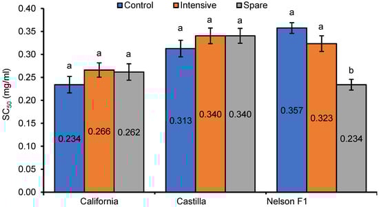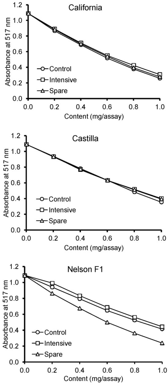 The results of the DPPH assay are depicted in Figure 1 and Figure 2. For all extracts, dose-related antiradical activity against DPPH• was observed. Comparing SC50 values, the effect of fertilization was not observed for extracts of the California and Castilla varieties. In turn, the extracts of the seeds from the Nelson F1 spare group exhibited stronger antiradical activity against DPPH• than the extracts from the intensive and control groups.