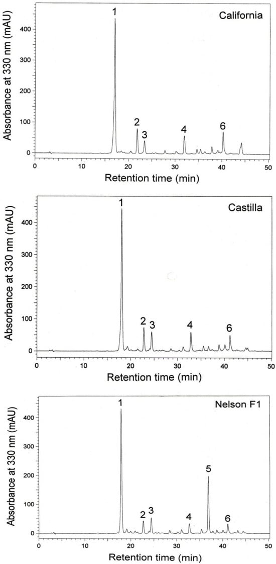 The HPLC chromatograms of the extracts were characterized by the presence of five (California and Castilla) and six (Nelson F1) main phenolic compounds (Figure 3). Applying the original standards, compounds 1 and 4 were identified as sinapine and sinapic acid, respectively. Based on the DAD-UV spectra, it was tentatively found that compounds 2, 3, 5, and 6 were derivatives of sinapic acid.