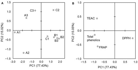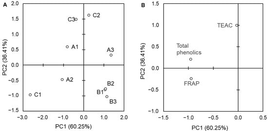 Plots of principal component analysis (PCA) of the objects (A) and variables (B) for data relating to extracts. A1—California control group; A2—California intensive group; A3—California spare group; B1—Castilla control group; B2—Castilla intensive group; B3—Castilla spare group; C1—Nelson F1 control group; C2—Nelson F1 intensive group; C3—Nelson F1 spare group; TEAC—Trolox equivalent antioxidant capacity; FRAP—ferric-reducing antioxidant potential; DPPH—DPPH radical scavenging activity.