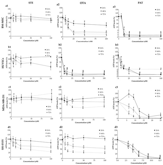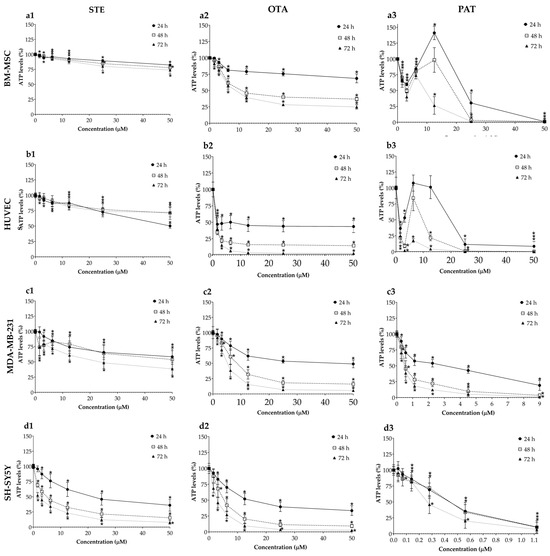 Cytotoxic effects of STE (column 1, a1,b1,c1,d1), OTA (column 2, a2,b2,c2,d2) and PAT (column 3, a3,b3,c3,d3) on BM-MSCs (row a), HUVECs (row b), MDA-MB-231 (row c) and SH-SY5Y (row d) cells cultured in monolayer. Cell viability was determined by means of the ATP assay after 24, 48 and 72 h of exposure. Data are expressed as the mean ± SEM of three independent experiments (n = 3). (*) p ≤ 0.05 indicates a significant difference compared to the control.