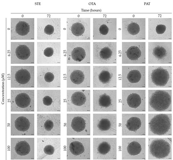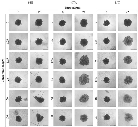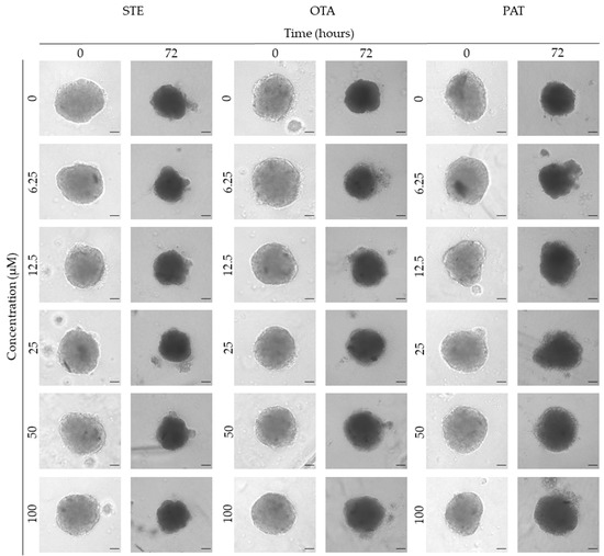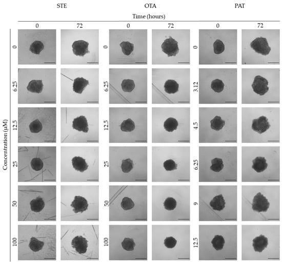 Representative bright-field images of MDA-MB-231 spheroids after 0 and 72 h of exposure to STE, OTA and PAT. Spheroids exposed to the same amount of solvent (MeOH) were used as the control. Images were obtained using the Light Microscope Zeiss Axio Observer (Zeiss Microscopy, Germany). Scale bar: 500 μm (magnification 2×).