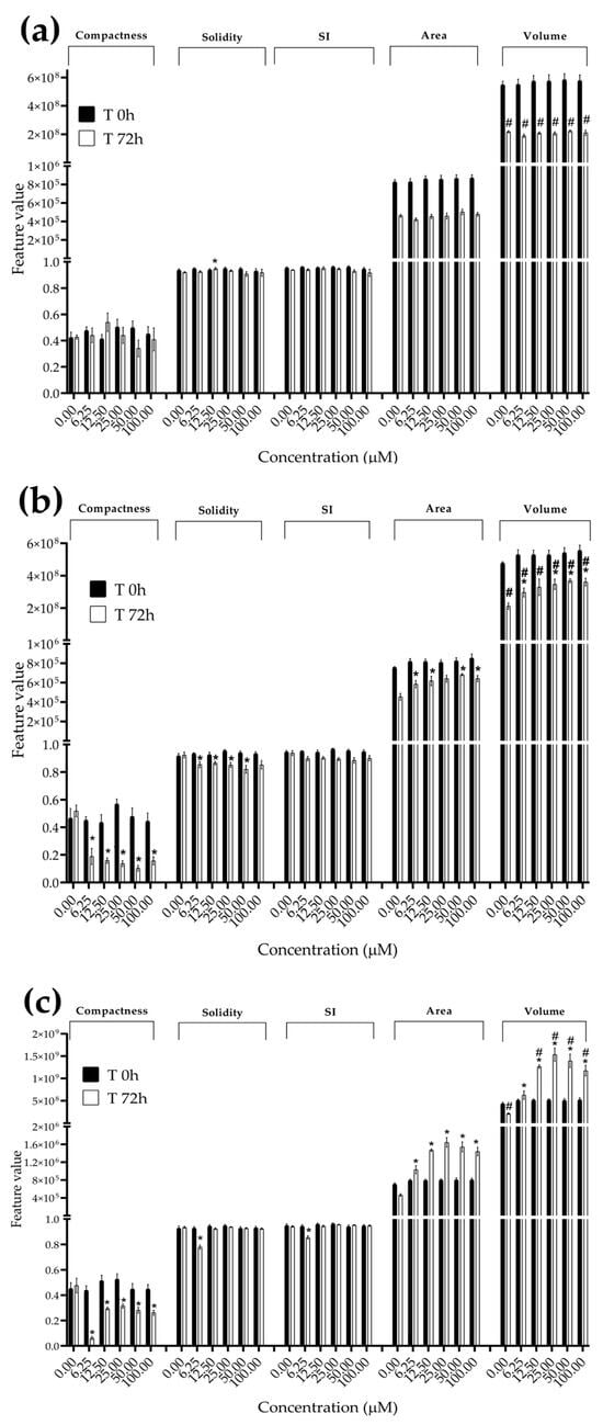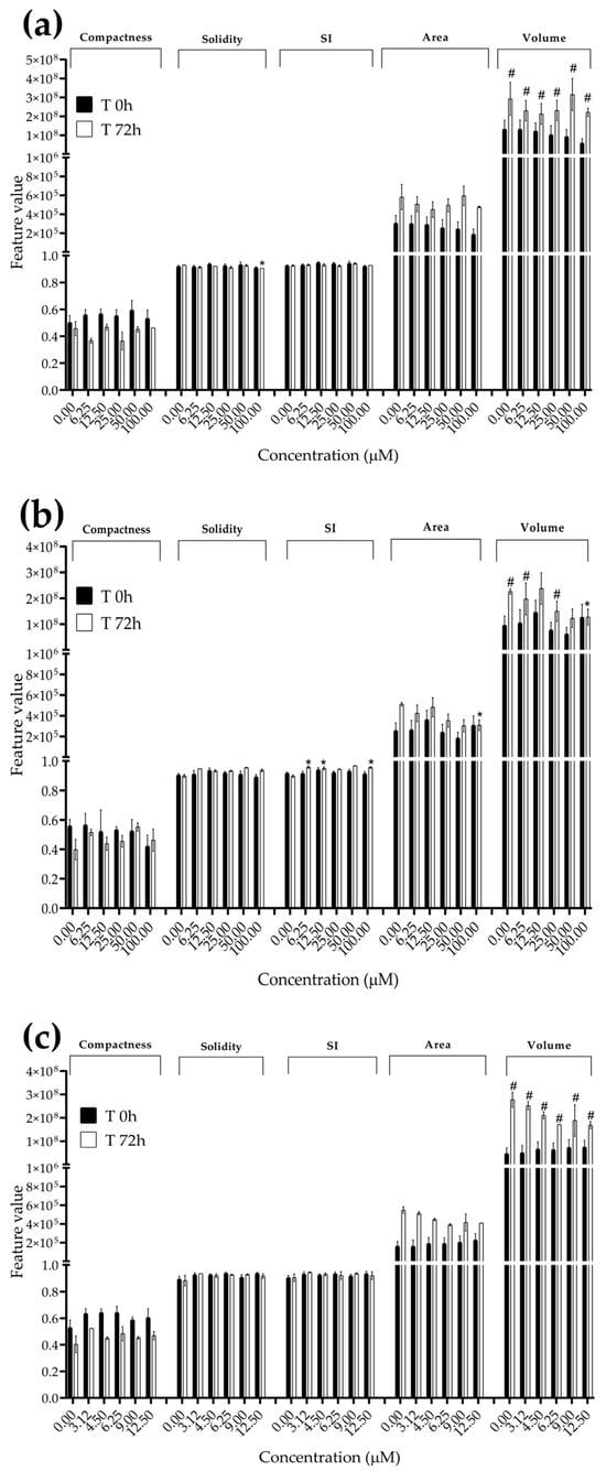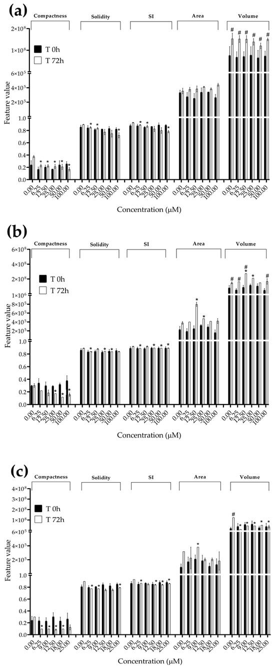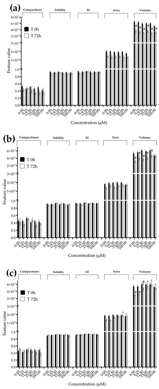 Morphological parameters of MDA-MB-231 spheroids after 0 and 72 h of exposure to (a) STE, (b) OTA and (c) PAT. Compactness, solidity, SI, area and volume were determined after 0 and 72 h of exposure using AnaSP software. Data are expressed as the mean ± SEM of three independent experiments (n = 3). (*) p ≤ 0.05 indicates a significant difference compared to the control. (#) p ≤ 0.05 indicates a significant difference compared to the respective T 0 h.