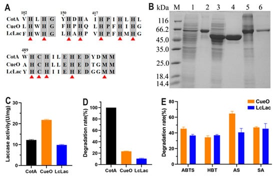 Expression of three bacterial laccases and investigation of their FG-degrading capacity. (A) Amino acid sequence alignment of the four copper-binding motifs. The twelve copper-binding residues are highlighted with a red arrow. (B) SDS-PAGE analysis of three bacterial laccases. Lane M, molecular mass standard; Lane 1, crude CotA extract; Lane 2, purified CotA; Lane 3, crude CueO extract; Lane 4, purified CueO; Lane 5, crude LcLac extract; and Lane 6, purified LcLac. (C) Laccase activity of CotA, CueO, and LcLac with ABTS as substrate. (D) Degradation of FG by CotA, CueO, and LcLac in the absence of redox mediator. Reaction condition: pH 7.0, 37 °C, initial FG content 20 μg mL−1, enzyme amount 1.0 U mL−1, and incubation time 1 h. (E) Degradation of FG by CueO and Lalac in the presence of redox mediator. Reaction condition: pH 7.0, 37 °C, initial FG content 20 μg mL−1, enzyme amount 1.0 U mL−1, redox mediator content 1 mM, and incubation time 1 h. All data are presented as mean ± SD (n = 3).