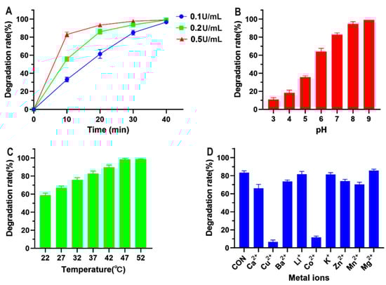 Taking into account that CotA laccase achieved the highest FG degradation rate in the absence of redox mediators among the three bacterial laccases, the enzymatic properties of CotA laccase for directly oxidizing FG were further investigated in this study. The time-dependent FG degradation by different amounts of CotA laccase is presented in Figure 2A. The degradation rate increased linearly from 33% at 10 min to 97% at 40 min at a CotA laccase dosage of 0.1 U mL−1. With the increase in enzyme amount to 0.2 and 0.5 U mL−1, the degradation rate within 10 min reached 56% and 83%, respectively. Moreover, more than 90% FG degradation was recorded at 30 and 10 min, respectively, by 0.2 and 0.5 U mL−1 CotA laccase. pH and temperature have important impacts on the biocatalytic capacity of enzymes. As shown in Figure 2B, the FG degradation rate increased when the pH was increased from 3.0 to 9.0, and FG was completely detoxified at pH 9.0. Similarly, the maximum activity of CotA laccase towards other phenolic substrates including zearalenone, 2,6-dimethoxyphenol, and syringaldazine was observed at neutral and alkaline pH conditions [20,26]. The influence of temperature on FG degradation by CotA laccase is presented in Figure 2C. The FG degradation rate increased from 59% to 98% with the increase in temperature from 22 to 47 °C, and the rate maintained a percentage of 99% at 52 °C. Indeed, CotA laccase orthologs from Bacillus species are well-known thermophilic enzymes with optimum temperatures ranging from 50 to 80 °C [27,28,29]. The impact of different metal ions on CotA laccase-catalyzed FG degradation is shown in Figure 2D. The presence of Li+, K+, and Mg2+ showed little effect on FG degradation by CotA laccase, whereas Ca2+, Ba2+, Zn2+, and Mn2+ at 10 mM resulted in a more than 10% reduction in the FG degradation rate. Moreover, Cu2+ and Co2+ could strongly inhibit the FG-oxidizing activity of CotA laccase. Consistently, Sun et al. [30] also recently documented the inhibitory effect of Cu2+ and Co2+ on CotA laccase for oxidizing alternariol, probably owing to their interactions with the electron transport system of the enzyme.