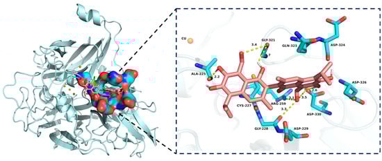 Molecular docking was carried out to investigate the interaction model of FG with CotA laccase. As shown in Figure 3, FG was docked into the active pocket of CotA laccase with a binding free energy of −33.5 kJ/mol. The visualized image revealed that FG was producing only some fruitful binding conformations at the active site cavity due to the bulky planar ring structure of the substrate. Consistently, molecular docking studies revealed that ABTS did not occupy the whole part of the substrate pocket of CotA laccase [27]. The low binding free energy of the CotA/FG complex indicated that the configurations of FG within the active site were effective for productive binding. The substrate binding pocket was formed by Ala 225, Cys 227, Gly 228, Asp 229, Arg 259, Gly 321, Gln 323, Asp 324, Asp 326, and Asp 330. Hydrogen bonds played a key role in favoring the stability of the CotA/FG complex. There were seven hydrogen bonds formed between FG and amino acid residues Ala 225, Gly 228, Arg 259, Asp 330, and Gly 321. Among these amino acids, Gly 321 was also found to provide a hydrogen bond with aflatoxin B1 (AFB1) in a previous study [20]. The data of molecular docking were in agreement with the experimental results, both indicating that FG was a novel substrate of CotA laccase.