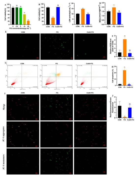 Cytotoxicity assessment of FG and its degradation products. (A) The viability of L−02 cells treated with different concentrations of FG for 24 h. (B) The viability of L−02 cells exposed to 20 μg mL−1 of FG and CotA laccase-catalyzed FG degradation products. For cell viability, values are represented as the mean ± SD (n = 6). (C) The leakage of LDH in the culture media. (D) Intracellular MDA content. (E,F) The fluorescence intensity of intracellular ROS. (G,H) Cell apoptosis rate measured by flow cytometry. Cells in the right lower and right upper quadrant were considered early and late apoptotic cells, respectively. (I,J) MMP analysis by JC−1 staining. Red fluorescence indicated the mitochondrial JC−1 aggregates and green fluorescence represented the JC−1 monomers. The MMP value was calculated as a ratio of the fluorescence intensity of JC−1 aggregates over JC−1 monomers. For C to J, data are presented as mean ± SD (n = 3). ns, not significant, * p < 0.05 and ** p < 0.01 in comparison with the CON group.