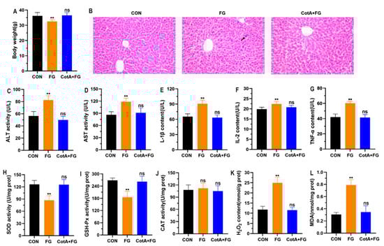 In vivo toxicity assessment of FG and its degradation products. (A) Body weight of mice at the end of the experiment. (B) Hematoxylin–eosin (HE) staining of representative liver sections. (C–G) Serum contents of ALT, AST, IL-1β, IL-2, and TNF-α. (H–L). Liver levels of SOD, GSH-Px, CAT, H2O2, and MDA. CON mice were treated with 100 mM, pH 7.0 sodium phosphate buffer; and FG mice were treated with 10 mg/kg BW of FG; CotA + FG mice were treated with 10 mg/kg BW of CotA laccase-catalyzed FG degradation products. All data are presented as mean ± SD (n = 6). ns, not significant, ** p < 0.01 in comparison with the CON group.
