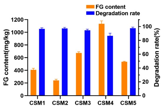 Degradation of FG in five defatted cottonseed meal samples (CSM1 to CSM5) by CotA laccase. FG content means the initial FG content in the samples. The degradation rate is calculated according to the residual FG content after CotA laccase treatment and the initial FG content in the samples. All data are presented as mean ± SD (n = 3).